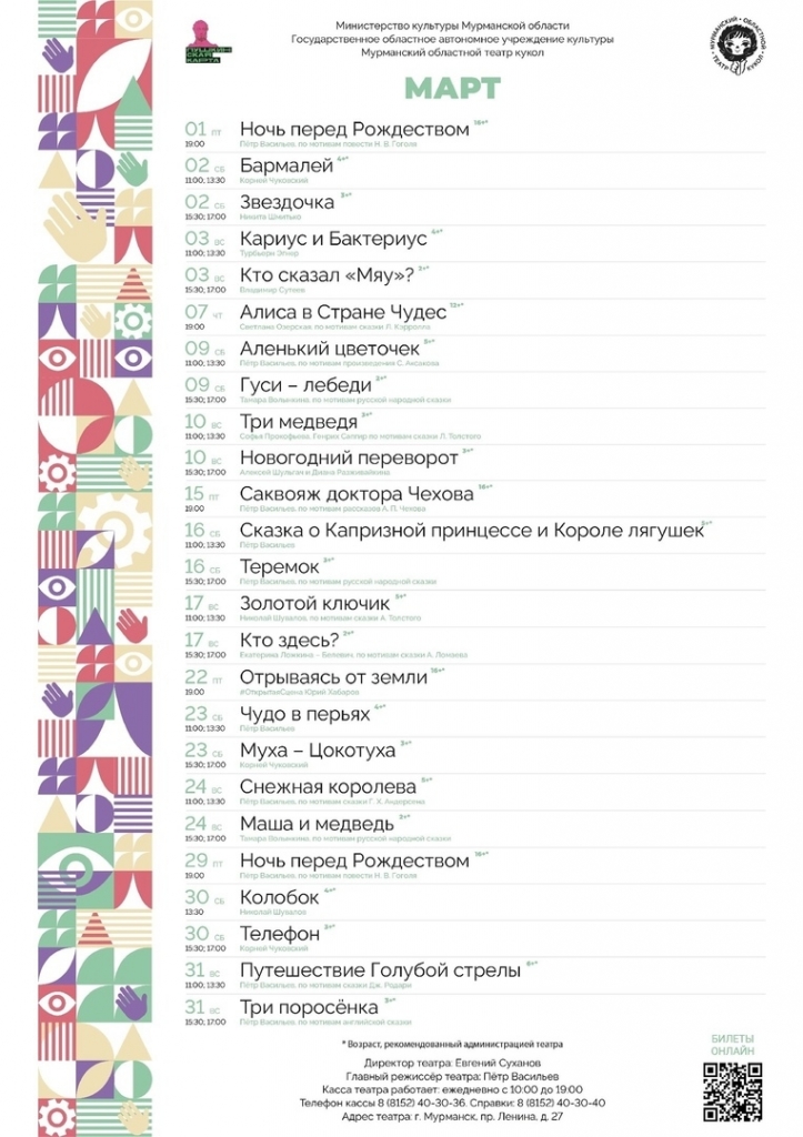 Репертуар Мурманского театра кукол на МАРТ В репертуаре марта найдется всё, даже песни под гитару. Копируйте афишу, выбирайте спектакли. Ждем вас в театре!Билеты онлайн можно приобрести на сайте посредника, очно - в кассе театра, тел. 40-30-36. События доступны по «Пушкинской карте». « Вернуться к списку статей
