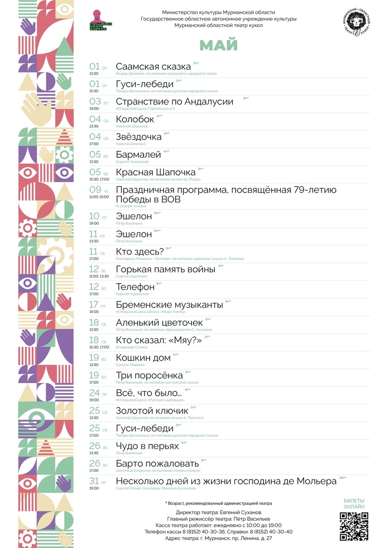 В мае зрителей - взрослых и малышей - порадуют не только спектакли, но и музыкальные представления. До конца театрального сезона действует акция «Четвертый билет - бесплатно» (при покупке трёх билетов сразу).