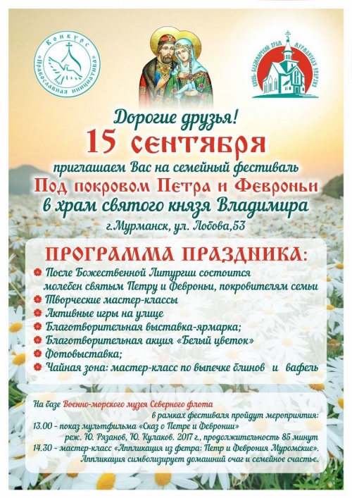 По окончании литургии состоится молебен святым Петру и Февронии, после чего начнутся творческие мастер-классы, активные игры на улице. Также гостей фестиваля ждет благотворительная выставка-ярмарка, фотовыставка и чайная зона с блинами и вафлями.